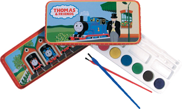 | A great tin litho Thomas pencil case. Has offical licensed Thomas graphics. Includes removable pencil tray, 6 watercolors and 2 brushes. Made by Schylling. For ages 2 & up. |
