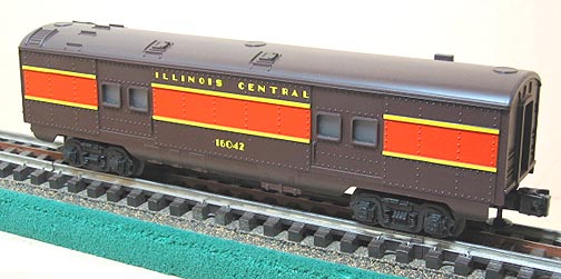 Short 027 streamlined baggage car, brown body with orange central stripe, not Illuminated, plastic 027 passenger trucks. |