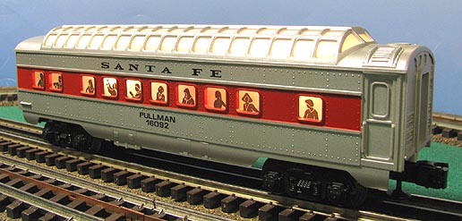 Produced by Lionel in 1995 as an add-on to the Santa Fe 0-27 passenger car series. All the passenger cars in this Santa Fe 0-27 series were available for separate sale. FEATURES: short 0-27 streamlined red stripe full vista dome * operating couplers * lighted interiors w/passenger silohouttes * plastic passenger trucks * undercarriage details * metal wheels/axles * authentic Santa Fe paint scheme |