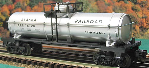 | Offered by Lionel in 1994. FEATURES: operating couplers * Symington-Wayne trucks * detailed underbody * metal handrails/ladders/platform * brake wheel * authentic ALASKA RR paint scheme (black script on silver body) * tanker is labeled "diesel fuel only" |