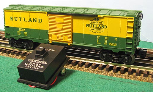 | Made by Lionel in 1991 and part of their special diesel/steam railsound boxcar product line. These special sound cars are a great addition to older Lionel engines where loco sounds bring your layout into the modern era. FEATURES: comes w/a special activator button that conects to the track * operating couplers * Symington-Wayne trucks * metal frame w/volume control knob * metal brake wheel * opening cargo doors reveals circuit boards * authentic Rutland paint graphics w/official logo |