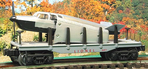 | Produced by Lionel in 1996. A remake of the postwar #6411 die-cast flatcar(1948-50). This was the first modern flatcar to be made entirely of die-cast metal. Feature; die-cast flatcar body, metal stakes, metal brake wheels, metal railings, die-cast metal sprung trucks with operating couplers, plastic beechcraft bonanza, and Lionel graphics. |