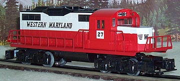| Western Maryland GP-20 cataloged only in service station set 6-11749. FEATURES:Dual can motors Illuminated cab and headlight Operating couplers Stamped-metal frame and railings Diesel horn |