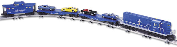 | Capture the spirit and beauty of the Ford Mustang GP-7 Set. Carrying four vintage, die cast Mustangs, this set will look good cruising your layout or sitting majestically on your mantle. GP9 loco has magnetraction, extra powerful pullmore motor, signal sounds with digital bell and whistle, die cast trucks, metal base, operating couplers, headlight and strobe light. Cars have metal trucks with springs, and lighted caboose has special metal caboose trucks. Upgradeable to full TMCC. Track and transformer not included. Our TS-15cc pak listed on this page is recommended. Set operates on regular O-gauge track. |