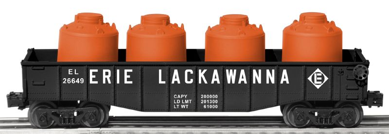 | Built by Lionel in 2011. FEATURES: operating couplers * plastic trucks * brake wheel * underbody detail * 4 removable canisters * authentic Erie Lackawanna markings plus official company logo on gondola sides |
