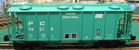| Built in 2007, this Penn Central PS-2 covered hopper car has a green body with white lettering. Car will run around O31 and greater curves. It features die cast metal sprung trucks, operating couplers on both ends with hidden uncoupling tabs, metal ends, and opening roof hatches. It measures 10.25" in length. Group 10.07.01.0166. |