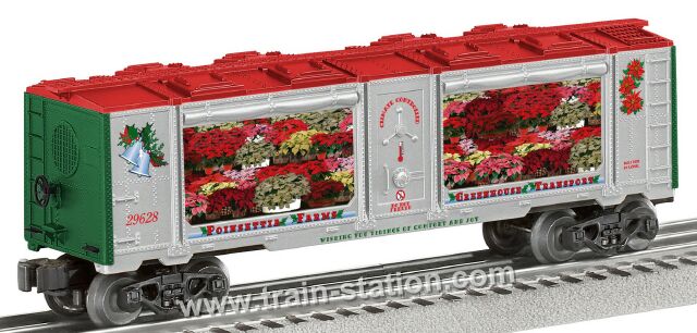 | This year the Poinsettia Farms Greenhouse is transporting this most famous Christmas flower across the nation by train. On an express route directly to your city, the Poinsettia plants stay fresh and beautiful in this climate-controlled freight car. A deluxe car with die-cast metal sprung trucks , operating couplers and metal frame Poinsettia flowers insert in car interior Length: 10 inchesOperates on any Lionel Fastrack, O27 or O gauge layout |