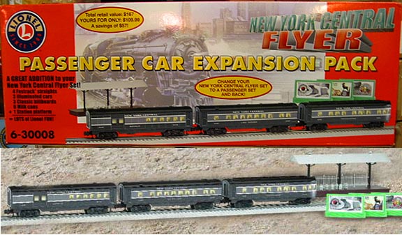 | Add NYC lighted passenger cars plus track and a station platform to your set. PACK INCLUDES: Combination car Coach Observation car Four straight FasTrack track sections Station platform Six milk cans Classic billboard set expands layout from 40" x 60" to 50" by 70" 10.07.01.0018 |