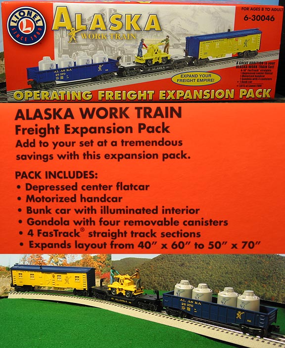 The Alaska Expansion Pack includes a motorized handcar carried on a flat carRemove the handcar and it will follow the train down the mainline under it's own power, or it can be run on a seperate track as well PACK INCLUDES: Gondola with containers, $ 29.99 Flatcar with handcar, $ 89.99 Bunk car with interior illumination, $ 29.99Four straight FasTrack track sections to expand the layout $ 15.56 Total retail value $ 165 For any Fastrack, 0-27 or 0 gauge layout Minimum Curve: O-27 10.07.01.0016 |