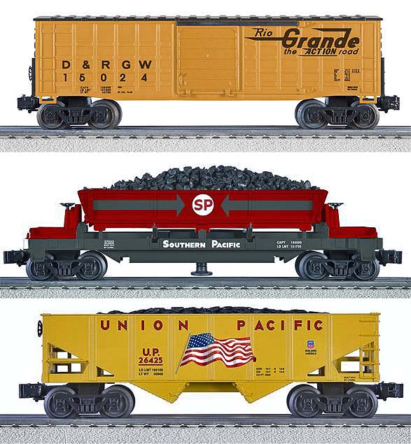 | Pack Includes: Waffle boxcar Coal dump car Hopper Three straight FasTrack track sections One FasTrack uncoupling track section Illuminated crossing shanty Set of six construction signs Maintenance kit Features: Operating couplers Opening doors on boxcar Removable coal load insert in hopper Operating coal dumping bin on coal dump car Gauge: Traditional O Gauge Dimensions: Length: 30" RailLine: Mixed Road Names Minimum Curve: O-27 |
