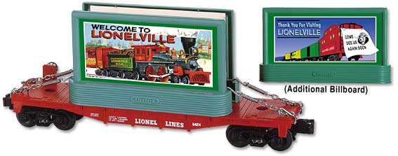 Die-Cast sprung trucks and operating couplers.Two Lionel billboards with unique Lionelville decoration secured to car with metal chains. |