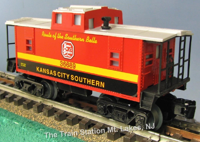 | This brilliant color graphics caboose is from the Kansas City Southern RY 4-car freight set, 6- 30186. FEATURES: die-cast metal trucks * operating couplers * lighted interior * metal chassis * underbody detail * smoke stack * authentic KCS high gloss paint graphics plus official company logo on caboose sides |
