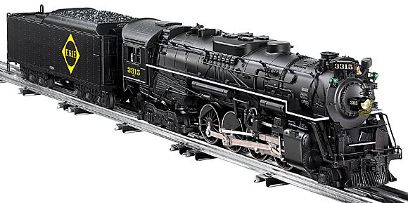 | FEATURES: TMCC Odyssey speed control system with on-off control Wireless tether connection between locomotive and tender Two fatboy speekers for the ultimate in sound reproduction Refined conventional transformer control mode with lower starting speeds, improved smoke output and simplified Odssey system controls Directional lighting including operating headlight, back-up light on the rear of the tender and front classification lights ElectroCoupler on the rear of tender Scale front coupler with interchangeable (O)- gauge coupler High torque Pittman motor with momentum flywheel Two traction tires Synchronized fan-driven smoke unit with improved output Die-cast metal locomotive body, pilot and trucks Die-cast tender body and trucks Separately applied metal details Variable ashpan glow Flickering firebox in cab Glass in cab windows Engineer and fireman figures Minimum Radius 0-54 Length 26 1/2 inches Authentic ERIE RR graphics plus official ERIE logo stamping on tender sides |