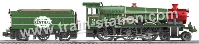 | Back by popular demand, the Santa Flyer 4-6-0 steam locomotive, this time dressed in glossy Christmas green! This timeless engine is perfect for pulling the wide variety of cars in your North Pole collection. Features Transformer controlled forward, neutral, and reverse operation Two operating headlamps One operating red headlight Operating coupler on rear of tender Electronic steam whistle Powerful maintenance-free motor Two traction tires Puffing smoke Cab window glass Separately applied metal handrails Die-cast metal locomotive body Metal frame on tender Locomotive Road Number: 2 Gauge: Traditional O Gauge Dimensions: Length: 18 inch RailLine: North Pole Central Minimum Curve: O-36 |