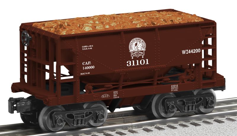 Regional Freight: Southwest Features Durable plastic trucks Operating couplers Removable ore load Gauge: Traditional O Gauge Dimensions: Length: 7" RailLine: Denver & Rio Grande Western Minimum Curve: O-27 |