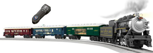 The Thomas Kinkade Christmas Set is sure to bring a new light to your train or Christmas display. The iconic lines and quality graphics and design of this classic toy train combine perfectly with Kinkade's amazing style to capture the warmth and spirit of an American Christmas. Features Set Includes: 0-8-0 Locomotive and coal tender "A Holiday Gathering" Baggage car, "Home for the Holidays" Combination car & "The Night Before Christmas" Observation car Wall-pack power supply and LionChief remote controller Locomotive Features: Electric locomotive controlled by remote with Operating headlight, Puffing smoke and On/Off switches for smoke and sound RailSounds RC sound system with steam chuffing and background sounds. User-activated whistle, bell, and announcements Chuffing sounds in sync with puffing smoke Die-cast operating coupler on front of locomotive and Operating coupler on rear of tender. Powerful maintenance-free motor Traction tires, Die-cast metal locomotive body and frame, Upgraded drive rod assemblyand Silver metal rims on drive wheels Engineer and Fireman figures Passenger Car Features: Die-cast metal six-wheel trucks, Operating couplers, Silhouette figures in windows, Lighted interiors, Authentic Kinkade art on passenger car sides, And signature Kinkade lantern on observation car drumhead at end of car LionChief Remote Features: Forward and reverse speed control knob. Three buttons to activate whistle, bell, and special announcements. Requires three AAA alkaline batteries (not included) Gauge: Traditional O Gauge Set Length: 43" Layout Dimensions: 40"x60" Minimum Curve: O-31 |