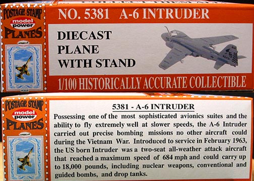 This is a brand-new Postage Stamp Plane by Model Power company. 1/100 scale A-6 Intruder A.F. Jet bomber with full load. Highly detailed die-cast mold with accurate paint scheme and markings. Comes in postage stamp display box with stand. |