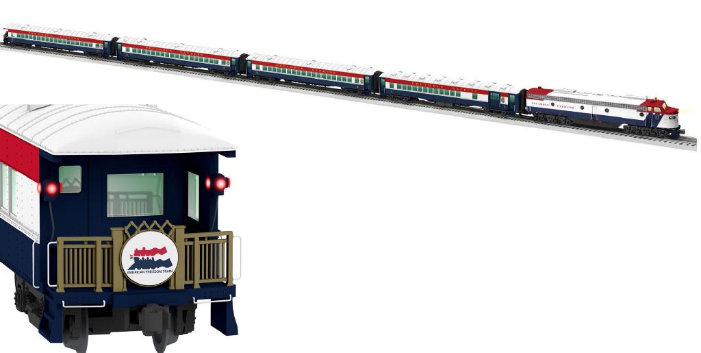 | Touring all 48 contiguous states in 1974, the Preamble Express scouted locations for the coming American Freedom Train. It gave railroads, promotors, local officials and first responders and the media an opportunity to prepare for the logistics involved in handling what would be one of the largest Bicentennial celebrations in the country. At the end of the trip, President Ford inaugurated the new Freedom Train from the back of observation car #4 before the cars were repainted and added to the consist of the larger exhibit train. E8 951 went back in service on the Union Pacific and retained its patriotic paint for some time in regular service before being repainted. SET INCLUDES: LOCOMOTIVE: LEGACY and Bluetooth control Mars, roof or ditch lights where appropriate by road name Odyssey II Speed Control Die-cast trucks, pilot and fuel tank Metal frame LEGACY Railsounds sound system featuring: LEGACY "Real-Time Quilling Horn" Current speed and fuel dialog, refueling sound effects PASSENGER CAR: Die-cast sprung six-wheel trucks Operating couplers with hidden uncoupling tabs Flexible diaphragms between cars Opening doors Detailed interiors with figures Flicker-free interior LED lighting Product Specifications: Gauge: O Gauge Dimensions: Length: 93 inches Minimum Curve: O54 |
