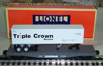 | Lionel's Norfolk Southern flat car with triple crown trailer, produced in 1992 and only available N&S Limited Edition set(6-11718). This car features; plastic STD O flatcar body stamped N&S with number, die-cast metal sprung trucks, and operating couplers, and removable Triple Crown trailer(individually numbered). Tough car to find broken up from the set. |
