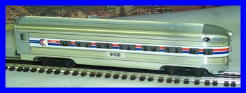 | Produced by Lionel in 1989 as part of the 7 car AMTRAK passenger set. FEATURES: Long extruded aluminum observation car w/"boat tail" style rear, 9l06 number plate, lighted interior w/passenger silouettes * operating couplers * die-cast passenger trucks * authentic AMTRAK red/white/blue arrow design on center of body. |