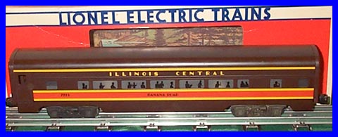 | Produced by Lionel in 1985 and 1987 to go with the I.C. F-3 set from the same years. Part of City Of New Orleans passenger set, whose components were all offered for seperate sale. Features long extruded alluminum passenger coach body, illuminated with window silhouettes, smooth sided medium brown painted body, orange and yellow striping, die-cast 4-wheel trucks, and lettered "BANANA ROAD". |