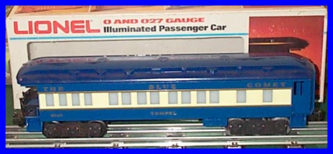 | 9500-style observation; TEMPEL; Blue unpainted plastic sides; dark blue roof; cream stripe through windows; gold lettering; gold stripes above and below windows; full detailed undercarriage; illuminated; die-cast six-wheel trucks; two disc couplers. Part of Blue Comet set,whose components were all sold separately. |