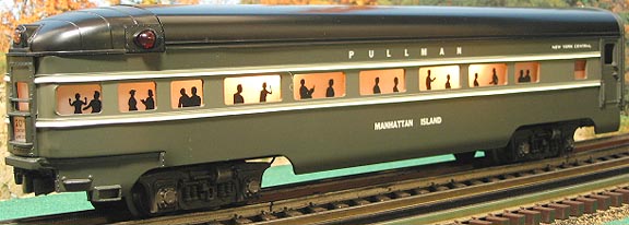 | Produced by MPC era Lionel in 1983-84. Part of a six car set that was cataloged with NYC F-3 AA units(6-8370). These Twentieth Century Limited passenger cars were extremely popular, and looked great with any NYC engine, including Postwar F-3's. Features; long extruded aluminum observation car, painted two tone gray with white lettering and stripes, black roof, gray ends, window silhouettes, four-wheel O Gauge die cast passenger trucks, operating couplers, measures 15", named "MANHATTAN ISLAND", and authentic classic NYC Twentieth Century Limited paint scheme and graphics. |