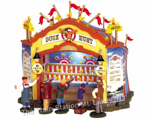 Lemax items and a little larger than Lionels 1:48 scale. Features Include: Animated with music background Exterior multi color lighting Duck targets revolve as the shooters take aim Red lights flash as the shooters hit the targets ON /OFF switch with volume control Approx. size: 7 5/8 x 8 1/8 x 6 1/4 inches |