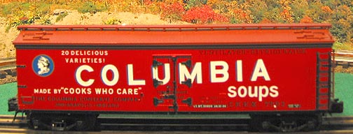 | This is a scale size O-gauge reefer w/abundant detail from Atlas. Features: 3-rail * die-cast sprung trucks * operating couplers * authentic coupler w/high pressure brake hose conections * full underbody detail * opening cargo doors w/latch locks * metal ladders & grabirons * authentic Columbia Soup graphics |