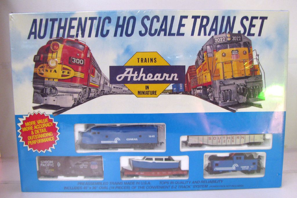 | This set features the Conrail F7 diesel loco, Southern 2216 gondola, 22140 caboose, flat car with boat and Union Pacific box car. Also comes with 14 pieces snap track to make a 45 x 36 inch oval. No power pack. New, shrinkwrapped in box. |