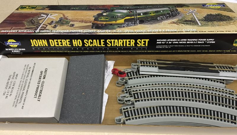 | Ideal for the HO operator or John Deere Collector! This set was made in 1999 and is the accessory box that accompanied the John Deere themed train sets. This set includes an Athearn UL listed Trainpack power supply and enough track to build a 45" x 36" oval nickel silver E-Z track system. |