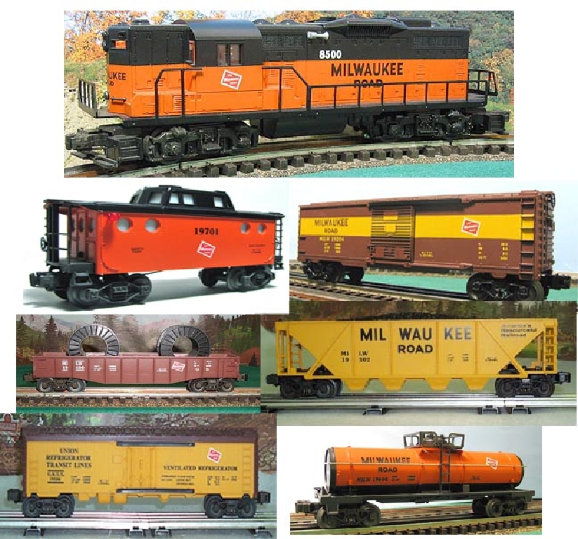 | Milwaukee Road Set from 1987, it has been run but looks and works like new. Set includes: 6-18500 GP9 Diesel engine 6-19204 box car 6-19302 hopper car 6-19400 gondola car 6-19500 reefer car 6-19600 tank car 6-19701 lighted caboose All cars have boxes but the boxes are not in great shape. The engine works great. Engine Features: Lionel pullmore motor working headlight opeating horn. The cars have sprung metal trucks with operating couplers. |