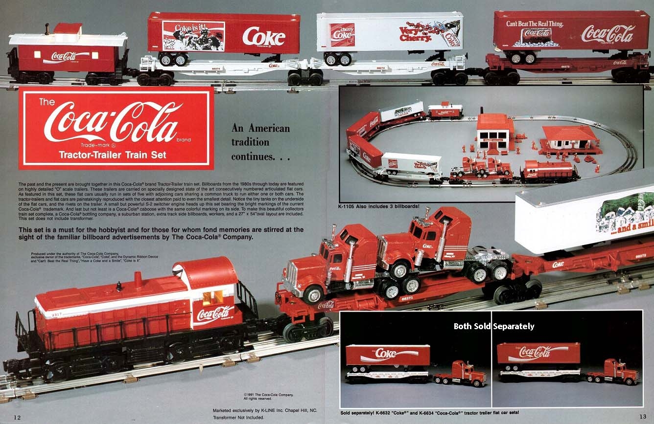 Set is like new with minimal running time. Produced by K-line in 1990. At the time this was a trail blazing set. Highly detailed O scale trains adorned with official 1980's Coke gaphics and logo's. Headed by a powerful MP-15 engine. Newly designed TTAX trailer flatcars with coke container loads. All Includes; five TTAX articulated flat cars; four truck trailers; two die-cast tractors; lighted caboose; bottling plant & suburban station kits w/figures & blillboards; 1990 catalog. The box is huge! |