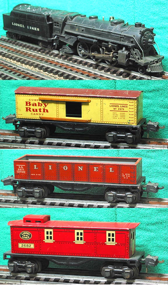 | Classic Lionel prewar starter outfit that Lionel cataloged over a four year period(1938-41). Includes old reliable 1666E diecast steamer with 2689T or 2389W(gunmetal in 38, and black after that). The set was 11.95 without the whistle and $15.95 with the whistle. Included 2000 series metal litho cars with automatic couplers; 2680 tankcar(early 38-39), or 2677 gondola(late40-41); 2679 Babyruth boxcar; 2682 caboose. The was superior to the cars in this set. The 1666 would even carry over to the postwar era. |