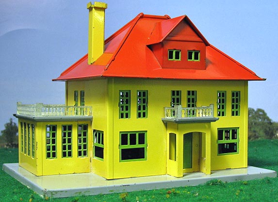 | 1923-32. Uncatalogued and available on scenic plots through 1942. Steel construction, two story plus attic design with added wing (called a 'sun porch' or 'train room' by many collectors). Enameled base, walls, hip roof with chimney and with or without two large dormers. Separate window and door inserts. Open porch area with flat roof surrounded by decorative railing. Some with decal or rubber-stamped 'NO. 191 VILLA/MADE BY/THE LIONEL CORPORATION/NEW YORK' in black on underside of base. Illuminated. 7 1/8 x 5 x 5 1/4 high. Many variations are known. Bases may be painted mojave, tan, hiawatha gray or pea green. Walls may be enameled cream, yellow, terracotta or red crackle or lithographed to represent dark or light red brick. Porches may be enameled ivory, cream or yellow. Dormers (when present) may be enameled cream, yellow, sand, light red, crackle red or pea green. Roofs may be enameled red, light red, pea green, apple green or gray. Porch roofs may be cream, sand, mustard, mojave or hiawatha gray. Window inserts may be ivory, pea green, apple green or Stephen Girard green. Doors may be ivory, brown, maroon, red, pea green, apple green, Stephen Girard green or simulated wood grain. Chimneys may be lithographed brick or enameled cream, sand or yellow. Yellow is probably the rarest. Roof railings may be gold or nickel and roof paint may be pea green, dark green, gray or red. |