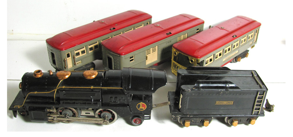 | Unusual set with the lowest priced loco (259E) and upscale 600 pullman, 601 observation, and 602 baggageEven more ususual because the passenger cars are the rarer grey version with red roofs instead of the usual all red versionEven though the loco was one of the lowest priced steam loco in the 1930's, it has the same motor as the more expensive locos and runs like a bandit! |
