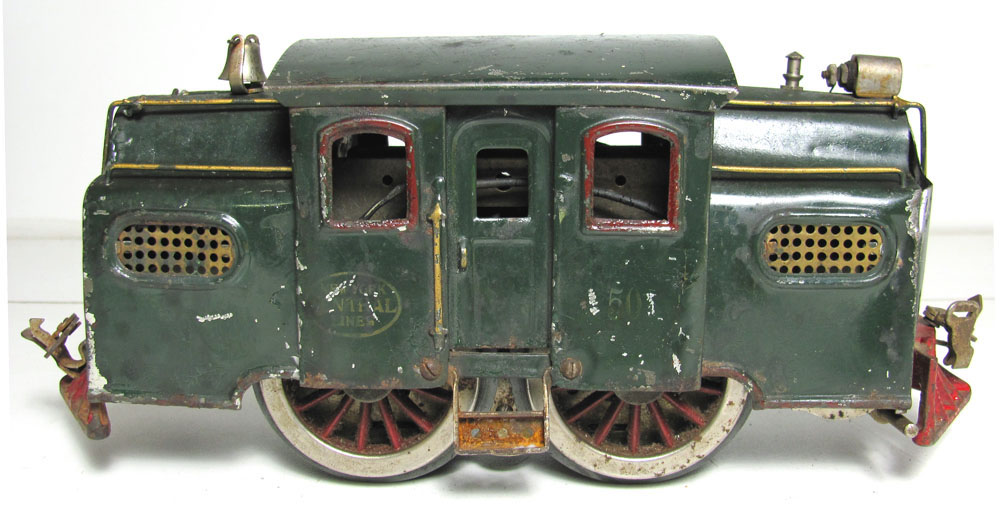 Somewhat rare and only produced in 1924. Same as the 38. Features large-gear Super Motor, red window trim and pilots, gold rubber-stamped New York Central lettering and number, brass ventilators, two steel strap headlights, gold painted handrails, nickel bell and whistle, three-hole steps, hand reversing unit, and latch or hook couplers. |