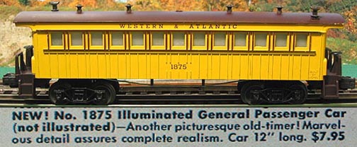| Most 1875 Passenger Cars are numbered 1875W and have a whistle inside, with one window cut out so the sound can be heard. A few were made without the cut-out window and the W was dropped from the number. 1959-1962. Simulated wood coach, yellow painted body with brown painted |