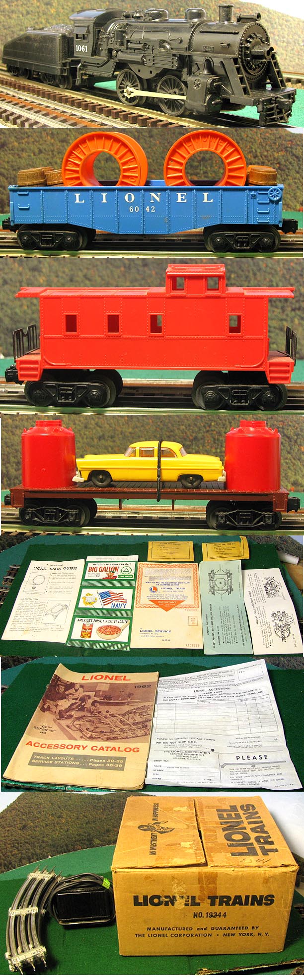 | Contents included 1061-25 Steam loco with 1061T-25 tender, 6042-25 Blue Gondola with 2 orange cable reels and 6 barrels, and 6406-25 flat car with Yellow auto and 2 red canisters Paperwork included:1-63 orange Warranty Card to be returned to factory, (not shown in picture in Schmid book)1-62 Lionel Accessory Order Form1123-40 '2- 62''Maintaining Efficient Pulling Power' instr sheet (blue)2869 6/63 'Make your Railroad Grow' sheetBillboard sheet with 3 billboards, in order, Cities Service Big Gallon, U.S Navy, and America's Finest Pork and Beans (Van Camp). NoteInstr sheet 11311-10 5/63 (Lionel train outfit), and Packet 1103-21 (Assembly 1103-20) with 2 81-32 connecting wires and 1 ctc lockon |