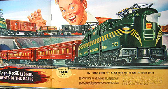the first GG1 set ever, and has stood the test of time and neary sixty years later remains one of the most highly prized sets of all time. The set was first issued as number 2124W in 1947, and as the 2144W in 1948 - 1949. Contents in 1948 were the 2332 Single Motor GG1, 2625 Irvington, 2627 Madison and 2628 Manhattan Pullmans. (In 1947 one common number 2625 was used for all 3 car names, These magnificent models of heavyweight Pullman cars have Bakelite bodies that are painted tuscan red. They featured detailed frames and six-wheel trucks. As such, they were the most realistic and technically advanced of all prewar passenger cars. The coach, typically referred to as a "Madison" or an" Irvington" car, was revived for postwar production. Initially, Lionel relied on a single number, 2625, to specify a ny of the three illuminated Pullman's with different names. Then in 1948 it went to three numbers, the 2625 Irvington, 2627 Madison, 2628 Manhattan. |