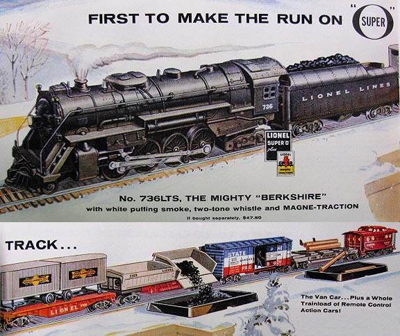 Top of the line steam set for 1957, and the first Super O Berkshire set. This set would include all repeat rolling stock items. The 823 is the rarer department store issue, 2289WS being the more common standard issue. The outfit box was also the new tan/brown basket weave look that was introduced exclusively for Super O. The engine was boxed without a liner in a corrugated carton(engine was wrapped in paper). While the tender and all the components came in Late Classic boxes. Contents included; 736 Bershire steam locomotive with headlight, smoke, and magnetractrion; 2046W Lionel lines whistle tender; 3359 operating twin-bin ore car; 3494-275 State of Maine operating boxcar; 3361 operating log car; 6430 flat with Cooper-Jarrett vans(should be white); 6427 NC5 porthole caboose; Super O track, 12 curves, 3 straight, 1 insulated, and 39-20 operating track packet; two 160 dump bins, SP smoke pill bottle, How to Operate booklet, 1957 Service Station booklet, 1957 billboard sheet, and directions(736, 3361, 3494-275, 3359, and Super O set track directions. |