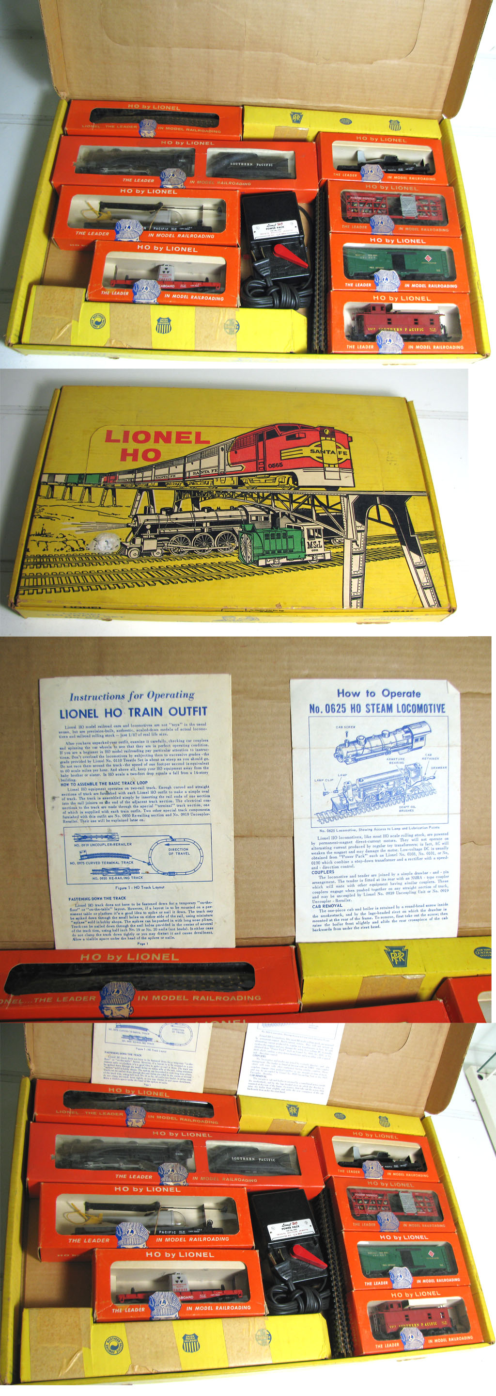 | These sets were made by Lionel in 1958. They comprised of an 0615LT 4-6-2 steam locomotive - 0814 auto transport car with four autos - 0865 Michigan Central gondola with canisters - 0864-175 Timkin box car - 0836 Lehigh Valley hopper - 0879 wrecker crane - 0819-100 B&M caboose - a large oval of track and an 0101 power pack. Came in a yellow cardboard box with display cut out. |