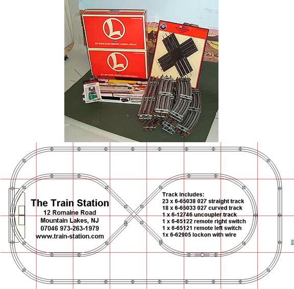 The best O-27 layout you can achieve with only two switches. This layout will fit on a 4*8 sheet of plywood. This package includes: 23 straight track; 18 regular curves; 1 UCS remote-control track; 1 pair of O-27 remote control switches (right and left); one 90-degree crossover; and one lockon with wire. This layout truely great play value for a child or adult. A nice package if your looking to upgrade your tired old track. Regular retail price is $154.95, but with this package you save $20. |