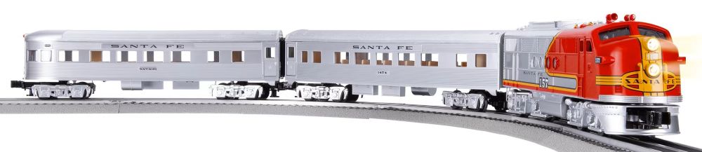 FEATURES LIST SET INCLUDES: Santa Fe FT diesel locomotive Coach Car Observation car Eight pieces of O36 curved FasTrack Three FasTrack 10" straight track sections li> One LionChief FasTrack Terminal section Wall-pack power supply LOCOMOTIVE FEATURES: Electric locomotive controlled by Bluetooth Lionel Cab3 app or LionChief Universal Remote (6- 83071 sold separately) Continuous Run Mode Option: Engine runs forward automatically, cycling through sounds at a fixed speed - No remote required! Lionel Voice Control (LVC) - run your locomotive by speaking commands into your phone via LionChief App RailSounds RC sound system with diesel revving and background sounds, horn, bell, and user-activated announcements Operating directional headlight Two powerful maintenance-free motors Operating couplers Illuminated cab interior On/Off Switch for BT/Run Mode PASSENGER CAR FEATURES: Operating manual couplers Illuminated and detail interior Flexible diaphragms between cars Opening doors Lionel Cab3 app features: Easy to download to your Apple or Android smart device (QR Code included inside!) Control multiple locomotives at the same time Volume control Change whistle/horn and bell pitch level Lionel Voice Control (LVC) - run your locomotive by speaking commands into your smart device! Momentum and speed settings