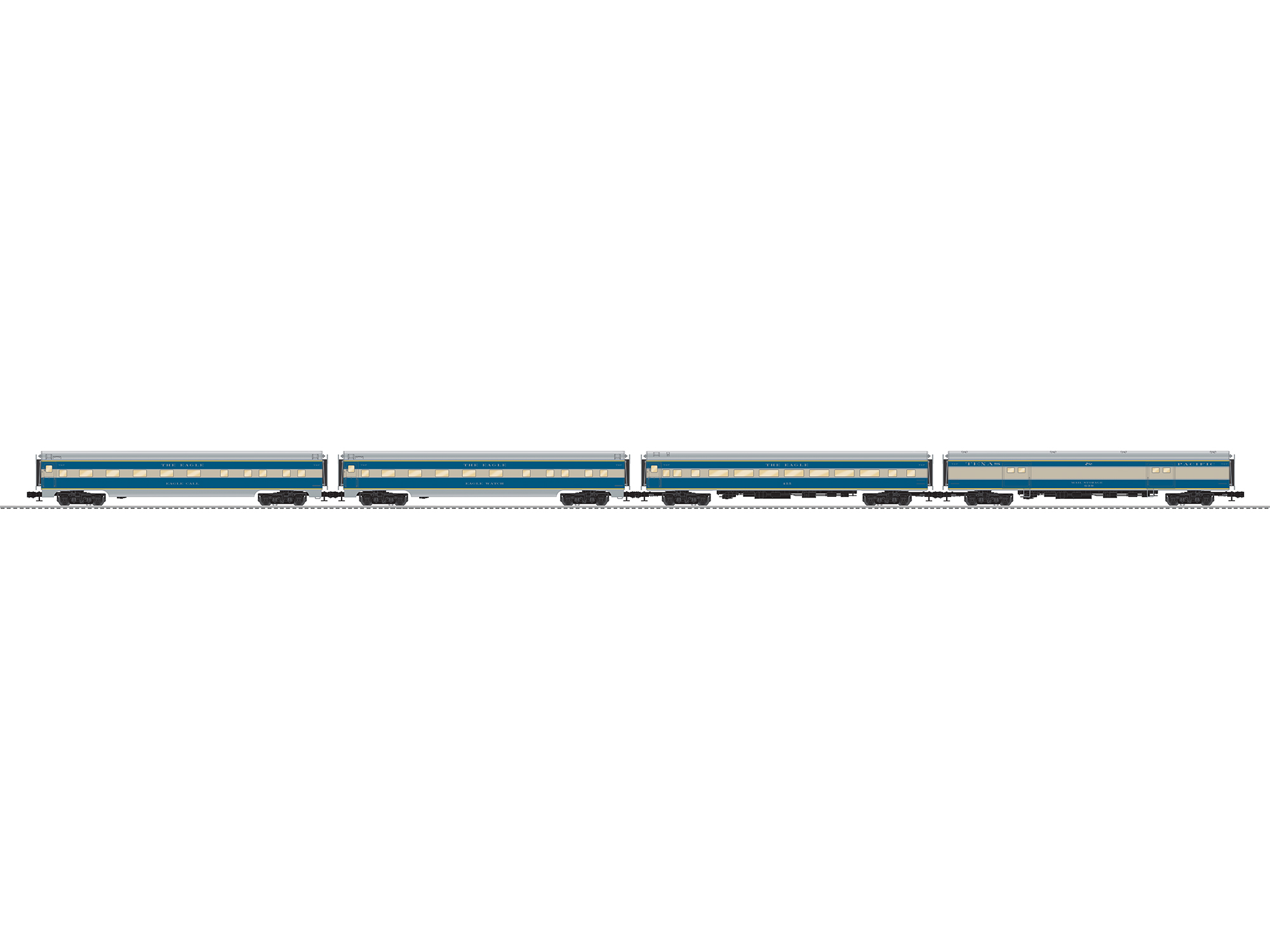 The Texas & Pacific found a pair of E units excessive for some of their smaller passenger trains. The road had 4 F7A and 2 F7B units equipped and painted for passenger service. Trains like the Louisiana Eagle often ran with the i nteresting pairing of an E and F unit combination. When not needed in passenger service, both the A and B units seemed to frequently show up on freight duty as well. Secondary trains like these are perfect for modeling. What they lack in fame, they make up for in character! And so we present the Louisiana E agle with a mixed set of E8/F7A, a SuperBass F7B a nd seven 18" streamlined passenger cars all in the beautiful blue and gray of the T&P! Aluminum body construction Die-cast sprung trucks Kinematic couplers Opening doors Flicker-free LED interior lighting Complete interiors with figures Separately applied detail parts |