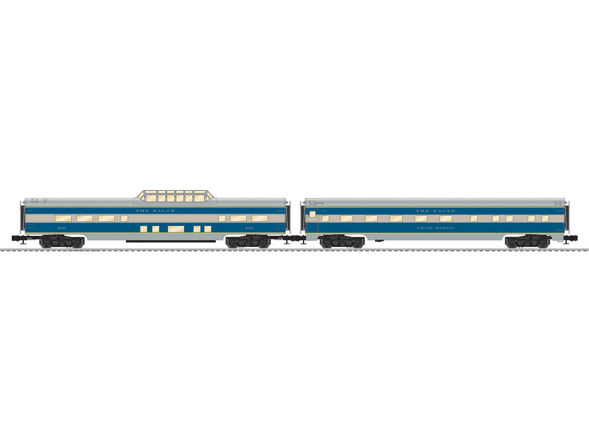 The Texas & Pacific found a pair of E units excessive for some of their smaller passenger trains. The road had 4 F7A and 2 F7B units equipped and painted for passenger service. Trains like the Louisiana Eagle often ran with the i nteresting pairing of an E and F unit combination. When not needed in passenger service, both the A and B units seemed to frequently show up on freight duty as well. Secondary trains like these are perfect for modeling. What they lack in fame, they make up for in character! And so we present the Louisiana E agle with a mixed set of E8/F7A, a SuperBass F7B a nd seven 18" streamlined passenger cars all in the beautiful blue and gray of the T&P! Aluminum body construction Die-cast sprung trucks Kinematic couplers Opening doors Flicker-free LED interior lighting Complete interiors with figures Separately applied detail parts |