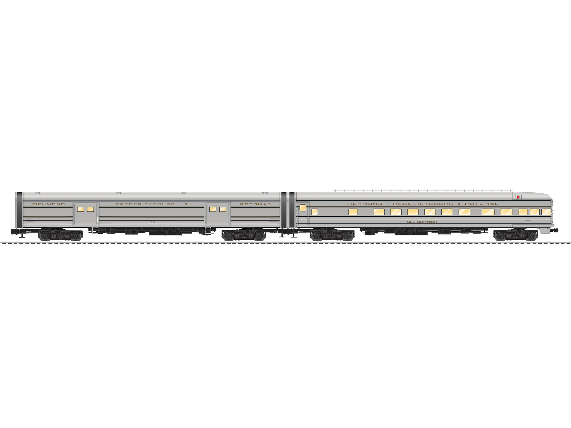 Following WWII, the RF&P got swept up in the streamliner craze along with the rest of the nation's railroads. In addition to helping to haul trains for the Seaboard and others, they wanted one of their own. It wasn't until 1947 that AC&F finally caught up to the order and delivered the five-car lightweight "Old Dominion." The streamlined consist included four coaches and a cafe lounge car. Finished in a special paint scheme of gray, blue and gold, the train made a daily round trip between Richmond and Washington DC. Despite the fanfare however, the train lost money from day one and only remained in s ervice for a few short months. Nevertheless, we f ound the streamliner too pretty to pass up! Rewrite a bit of history on your layout and add a matching baggage and observation to complete the train. It would look great behind the E8s shown here, or behind our recently delivered F19 Pacific! Aluminum body construction Die-cast sprung trucks Kinematic couplers Opening doors Flicker-free LED interior lighting Complete interiors with figures Separately applied detail parts |