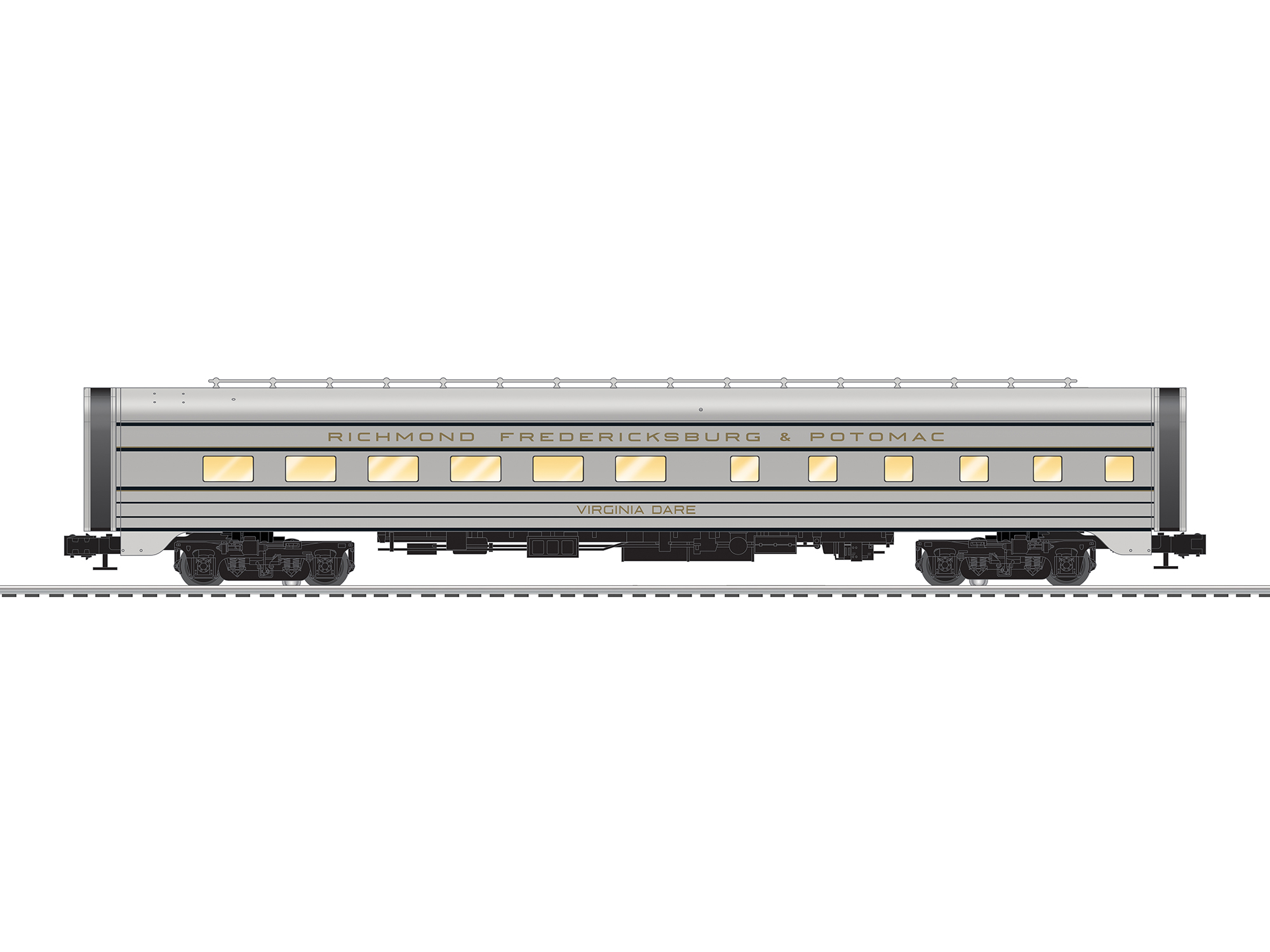 Following WWII, the RF&P got swept up in the streamliner craze along with the rest of the nation's railroads. In addition to helping to haul trains for the Seaboard and others, they wanted one of their own. It wasn't until 1947 that AC&F finally caught up to the order and delivered the five-car lightweight "Old Dominion." The streamlined consist included four coaches and a cafe lounge car. Finished in a special paint scheme of gray, blue and gold, the train made a daily round trip between Richmond and Washington DC. Despite the fanfare however, the train lost money from day one and only remained in s ervice for a few short months. Nevertheless, we f ound the streamliner too pretty to pass up! Rewrite a bit of history on your layout and add a matching baggage and observation to complete the train. It would look great behind the E8s shown here, or behind our recently delivered F19 Pacific! Aluminum body construction Die-cast sprung trucks Kinematic couplers Opening doors Flicker-free LED interior lighting Complete interiors with figures Separately applied detail parts |