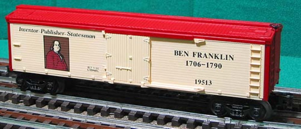 | "If you would not be forgotten, as soon as you are dead & rotten, either write things worth reading, or do things worth the writing" Ben Franklin. Franklin did both as he lived these words of wisdom being an Inventor-Publisher- Statesman, and much more. From Lionel's famous inventor series, this reefer celebrates Ben Franklin and all his contributions to the creation of this country. Produced in 1990. Has metal wheels and operating couplers. |