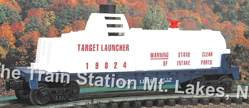 | Produced by Lionel in 1996. A remake of the classic Post-War #3470 (built from 1962 until 1964). This unique car has a track powered fan that suspends a balloon in mid-air even as the car moves down the track! Great entertainment by itself or get a missle firing car and try your aim. Features a plastic molded body, operating fan, track powered on/off switch, three balloons, and classic Post-War graphics. The box states "3470 Target Launcher", the car itself carried the cataloged #19824! Great car for the military layout. |